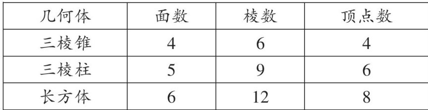 观察表格里的数据可以发现,棱数是3的倍数,顶点数是2的倍数。若设几何体的面数为 n ,那么,我们可以猜想:棱数为 3(n-2) ,顶点数为 2(n-2) 。(剩余1088字)