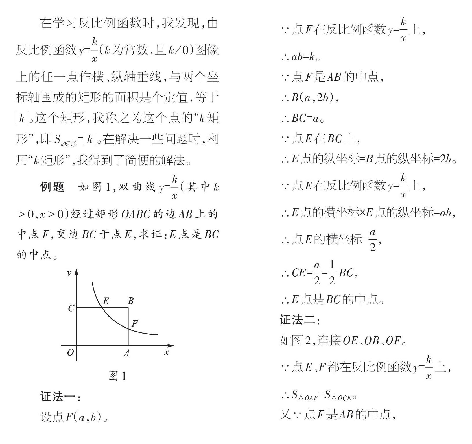 在学习反比例函数时,我发现,由反比例函数[y]=[kx](k为常数,且k≠0)图像上的任一点作横、纵轴垂线,与两个坐标轴围成的矩形的面积是个定值,等于[k]。这个矩形,我称之为这个点的“k矩形”,即[Sk矩形]=[k]。在解决一些问题时,利用“k矩形”,我得到了简便的解法。