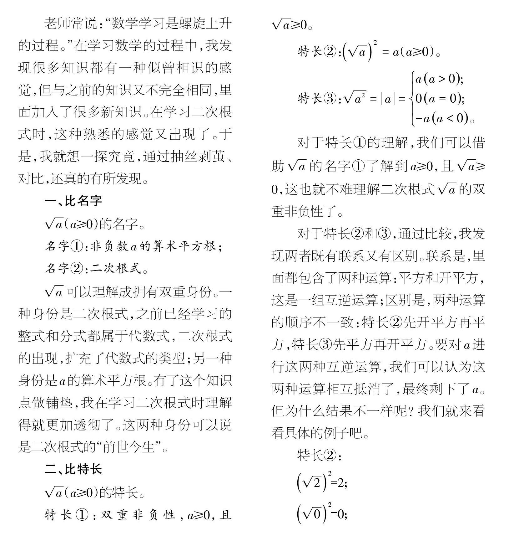老师常说:“数学学习是螺旋上升的过程。”在学习数学的过程中,我发现很多知识都有一种似曾相识的感觉,但与之前的知识又不完全相同,里面加入了很多新知识。在学习二次根式时,这种熟悉的感觉又出现了。于是,我就想一探究竟,通过抽丝剥茧、对比,还真的有所发现。