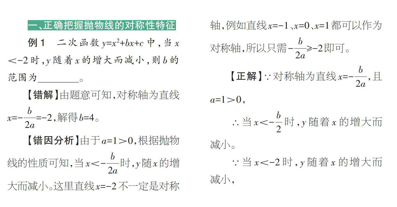 二次函数这一章要求我们能从二次函数的常见表达式中看出顶点坐标、对称轴等信息,能依据二次函数图像认识函数的特征与性质,能利用二次函数解决实际问题。其中,二次函数的对称性、增减性及含参型函数等更是每年中考考查的重点和难点。不过,在实际运用中,我们总会出现各种错误。本文列举一些典型错误并分析出错的原因,希望同学们能明确错误之处,做到举一反三。(剩余0字)