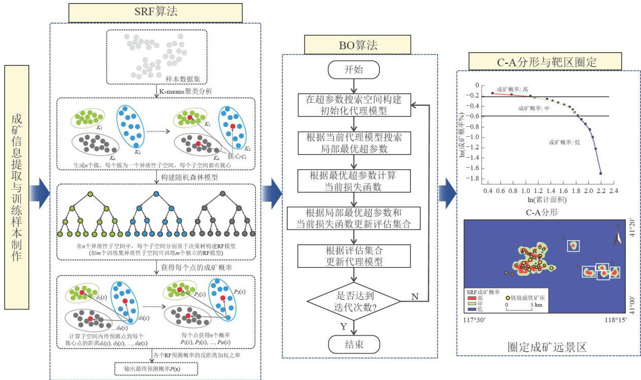 KeyWords:spatialrandom forest;Bayesian optimization;concentration-area fractal analysis;Damiao-Hongshila Fe-V-Ti ore belt;mineral prospectivity mapping