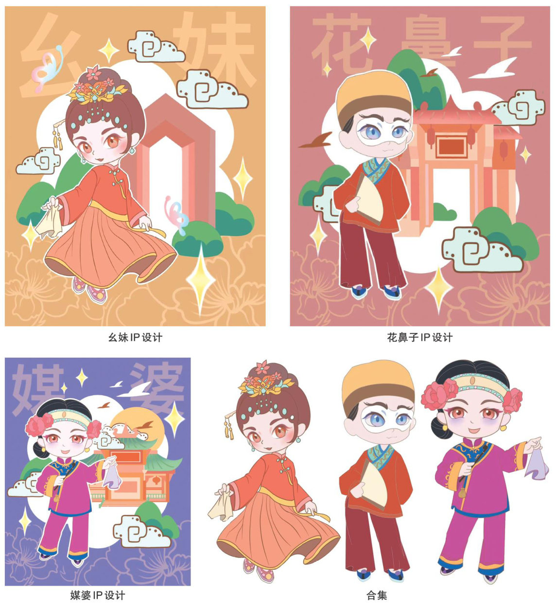 本设计围绕四川省非遗幺妹灯展开IP形象创作,从幺妹灯戏曲里的主要人物幺妹、花鼻子、媒婆身上提取显著特征,以此为依据进行设计构思。在设计过程中,兼顾了传统幺妹灯的核心要素以及现代年轻群体的审美喜好。(剩余155字)