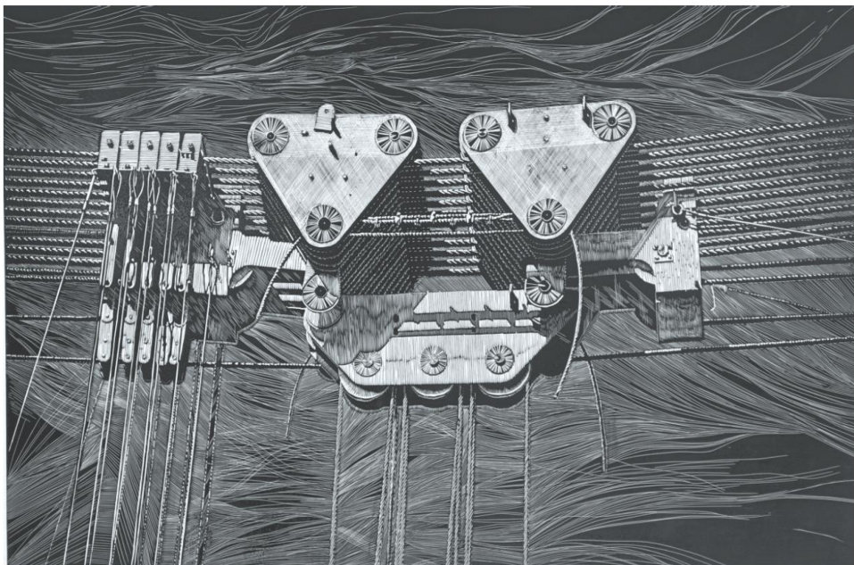 《发展的乐章》是以高质量发展为主题的黑白木刻版画。作品将吊钩化为琴拨,将钢索作为琴弦,构建工业与艺术交融的意象。(剩余68字)