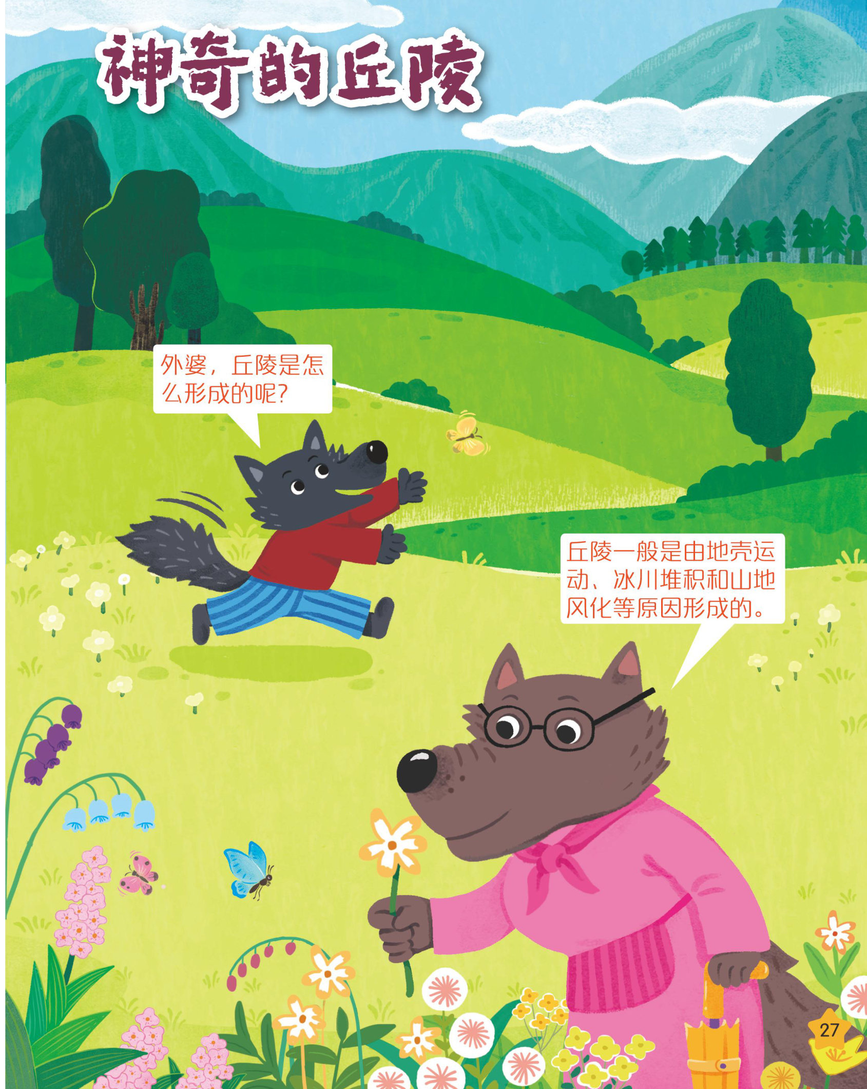 这时,天空下起了大雨。狼外婆打开雨伞和奇奇狼躲雨丘陵地区的气候受到地形影响,有时候会发生局部的天气变化,不过一般过一会儿就会停雨,