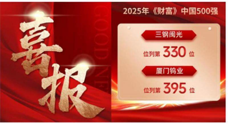 2025年7月22日,2025年《财富》中国500强排行榜揭晓,省工控集团权属企业三钢闽光、厦门钨业上榜。