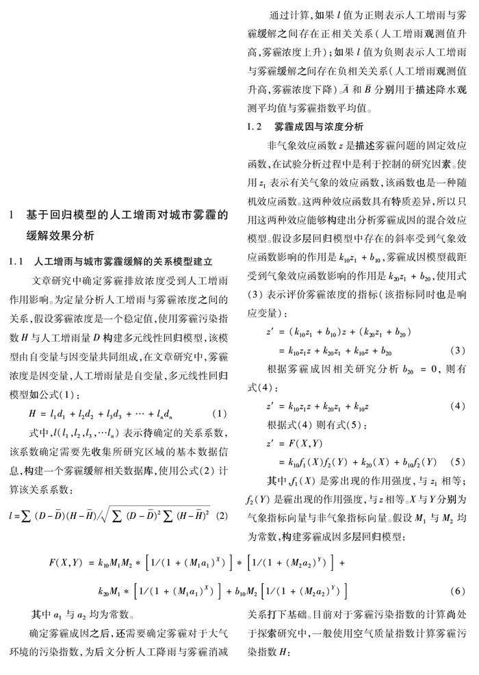 摘要:雾霾污染问题始终是影响人体健康与生态环境的隐患之一,为尝试缓解雾霾情况,建模分析人工增雨对城市雾霾的缓解效果。以广义线性降尺度模型分析人工增雨效果,得到人工增雨量;利用多层回归理论构建雾霾成因模型,在此基础上通过空气质量指数计算雾霾污染指数,将人工增雨量作为自变量,雾霾污染指数作为因变量,构建反映二者关系的元线性回归模型,并计算二者的关系系数,确定人工增雨对城市雾霾的缓解效果。(剩余520字)