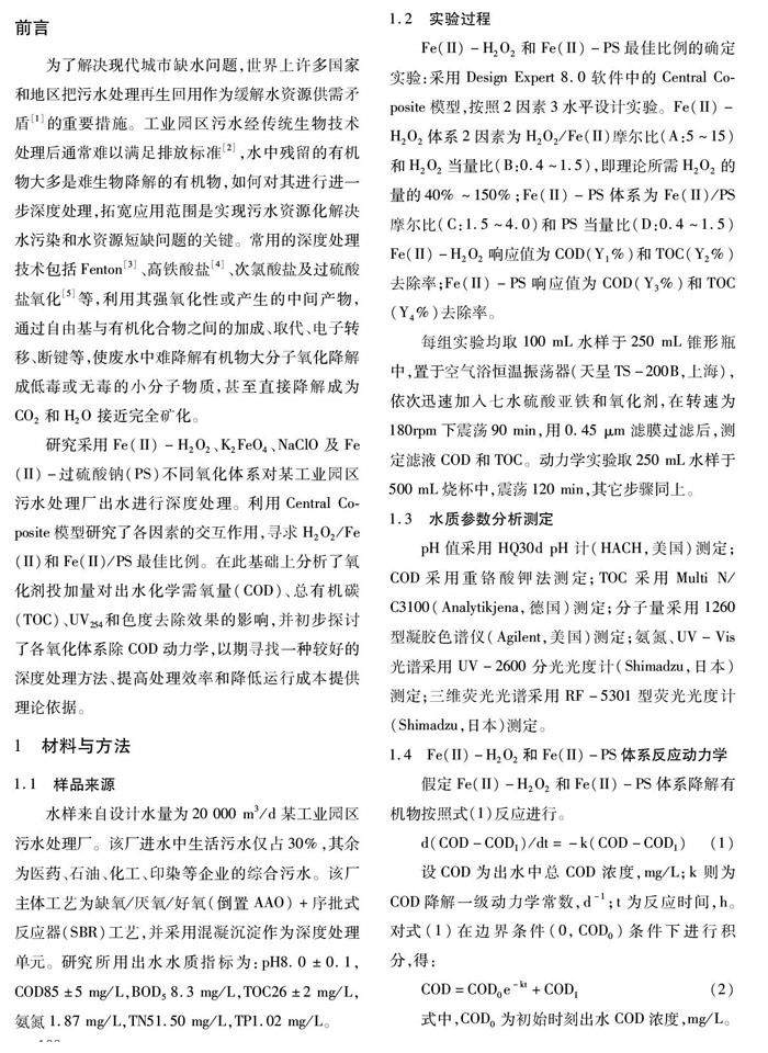 摘要:采用不同氧化体系处理某工业园区污水处理厂二级出水,利用Cennal Coposite模型考察了H2O2-Fe(Ⅱ)和Fe(Ⅱ)-PS之间的交互作用,确定了H2O2/Fe(Ⅱ)和Fe(Ⅱ)/PS最佳比例。在此基础上考察了氧化剂不同当量比对COD、TOC、UV254和色度去除效果。结果表明,H2O2/Fe(Ⅱ)和Fe(Ⅱ)/Ps最佳比例分别为10.41和2.74。(剩余347字)