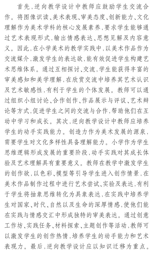 摘 要:当前,理解性学习成为我国教学的重要教学方针,教学课程的设置重点逐渐向以学生为主体转变。基于此,文章通过对逆向教学设计下的小学美术单元教学进行可行性分析,依据逆向教学的框架步骤设计,分析了其实践的关键思路。以苏少版《感官肌理》课程单元为实例进行实践应用,以此论证逆向教学设计的小学美术单元教学有效性意义,为小学美术的教学实践提供了有效研究基础。(剩余4566字)