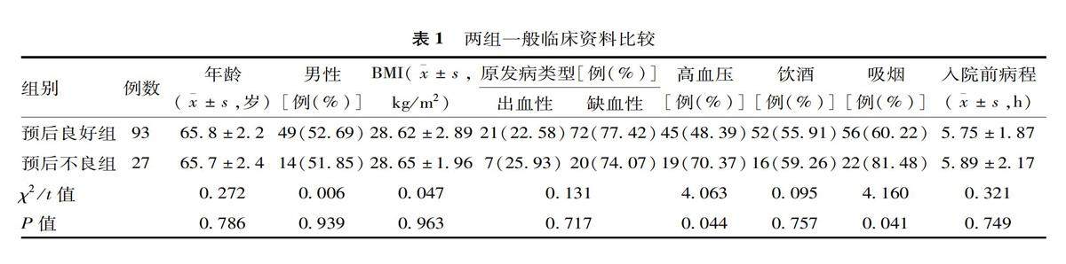 [摘要]目的探究老年脑血管病患者原发病特征、介入治疗后炎症指标及神经功能相关指标的差异,旨在为其预后判断提供依据。方法选取2020年1月~2022年12月于海南省人民医院接受介入治疗的120例老年脑血管病患者临床资料进行回顾性分析,根据患者预后划分为预后良好组(93例)与预后不良组(27例)。观察并比较两组患者一般临床资料[年龄、性别、体质量指数、原发病类型、是否患高血压、饮酒情况、吸烟情况、入院前病程]、介入治疗后炎症指标[中性粒细胞与淋巴细胞比值(NLR)、C反应蛋白(CRP)、淋巴细胞与单核细胞比值(LMR)]及神经功能相关指标[格拉斯哥预后量表(GOS)评分、美国国立卫生研究院脑卒中量表(NIHSS)评分、日常生活活动能力(ADL)评分及改良Rankin量表(mRS)评分]。(剩余9683字)