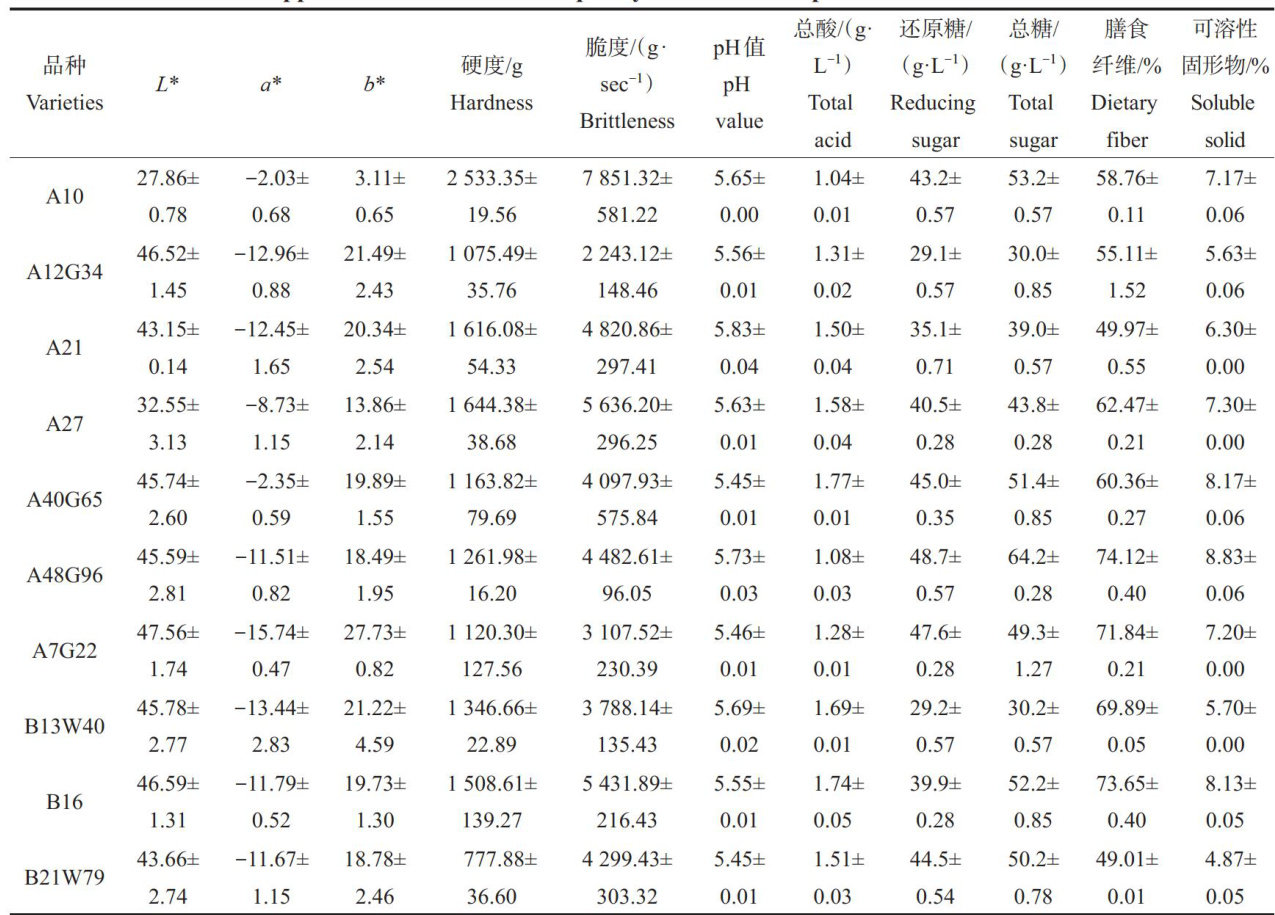 Abstract:Toexplorethepotentialutilizationvalueofwatermelonpeels fromdiferentvarieties,this studydetermnes 26 indexesincluding appearance,nutrientandactive substances contents derived from21types of watermelon pels.Ituses Orthogonal Partial Least Squares-Discriminant Analysis (OPLS-DA)to screenout the key substances that determine the qualitydiferencesof watermelon pels,and employs cluster analysis to classifythe utilization modes of watermelon peels. The results show that there are significant diffrences in the quality of watermelon pees among varieties (p<0.05) . The interspecific coefficient of variation is the highest for quercetin content (78.49%) and the lowest forpH value (2.18%) ).With totalacid,totalsgareducingsugardetaryfiber,totalphenolandmonomericpenolicontentsasrigialvarables,tis study performsOPL-Danalysistosreeout8keyindicators (i..p-coumaricacid,ferulicacid,myricetin,totalpenol, totalacid,totalsugar,educingsugarandsolublesolid).Basedontheseindicators,itconductsclusteranalysis,dividingthe 21 varietiesofwatermelonpeelsinto4categories: ClassI-Al2G34,A21,B13W40,B23W82,with highphenolotentin their peels; Class I-A4065,B21W79,B3,B5G19,B8W7,withhghsugarcontent intheirpeels; ClassIl-,A27, A48G96andsixothers(atotalof9varieties),withhighorganicacidcontentintheirpeels;ClassIV-D14H26,D4H7and GP,which are low in representative key substances but contain more than 50% dietary fiber,making themideal raw materialsfordietaryfiberpreparation.Theresultsof this study provide areference forthe high value and eficient utilization of watermelon peels.
