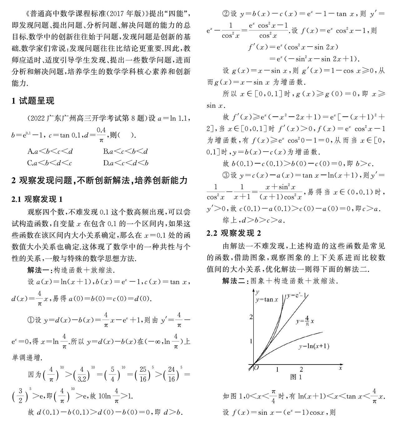 《普通高中数学课程标准(2017年版)》提出“四能”,即发现问题、提出问题、分析问题、解决问题的能力的总目标.数学中的创新往往始于问题,发现问题是创新的基础.数学家们常说:发现问题往往比结论更重要.因此,教师应适时、适度引导学生发现、提出一些数学问题,进而分析和解决问题,培养学生的数学学科核心素养和(剩余422字)