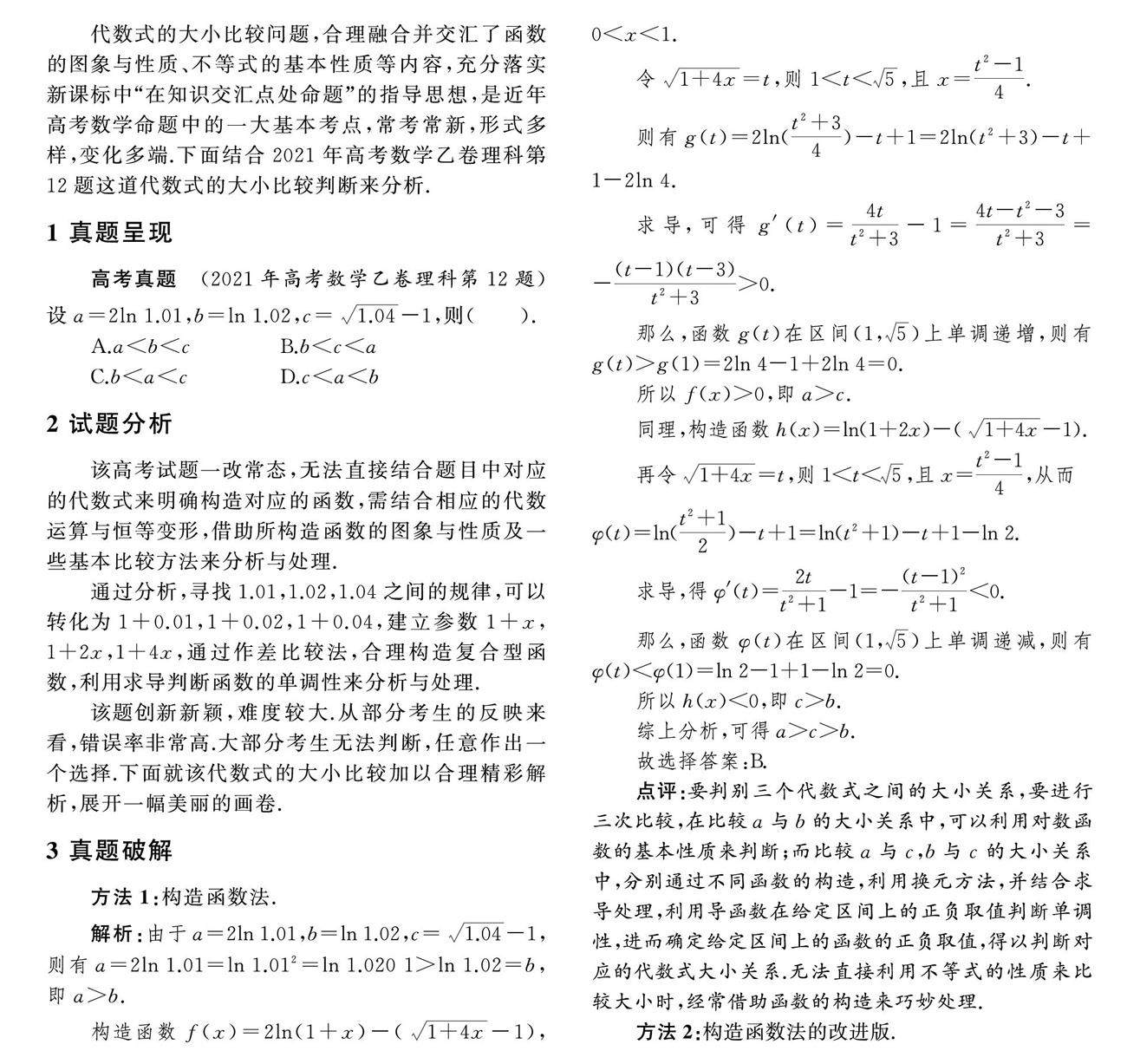 摘要:代数式的大小比较问题,一直是高考数学试卷中的一类常见热点题型.结合高考真题的分析与求解,剖析命题的创新点与亮点以及破解问题的方法技巧与策略,形成知识网络体系与方法策略,引领与指导数学学习与复习备考,给数学教学点滴启示.
