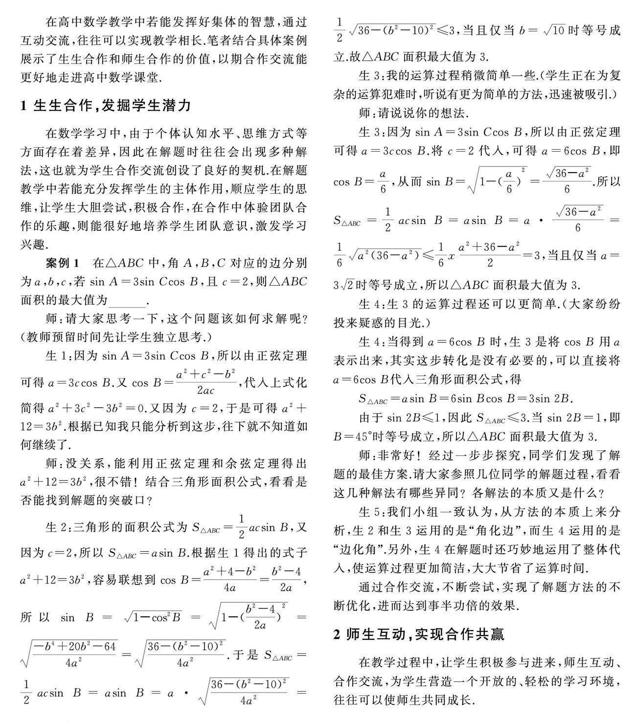 在高中数学教学中若能发挥好集体的智慧,通过互动交流,往往可以实现教学相长.笔者结合具体案例展示了生生合作和师生合作的价值,以期合作交流能更好地走进高中数学课堂.