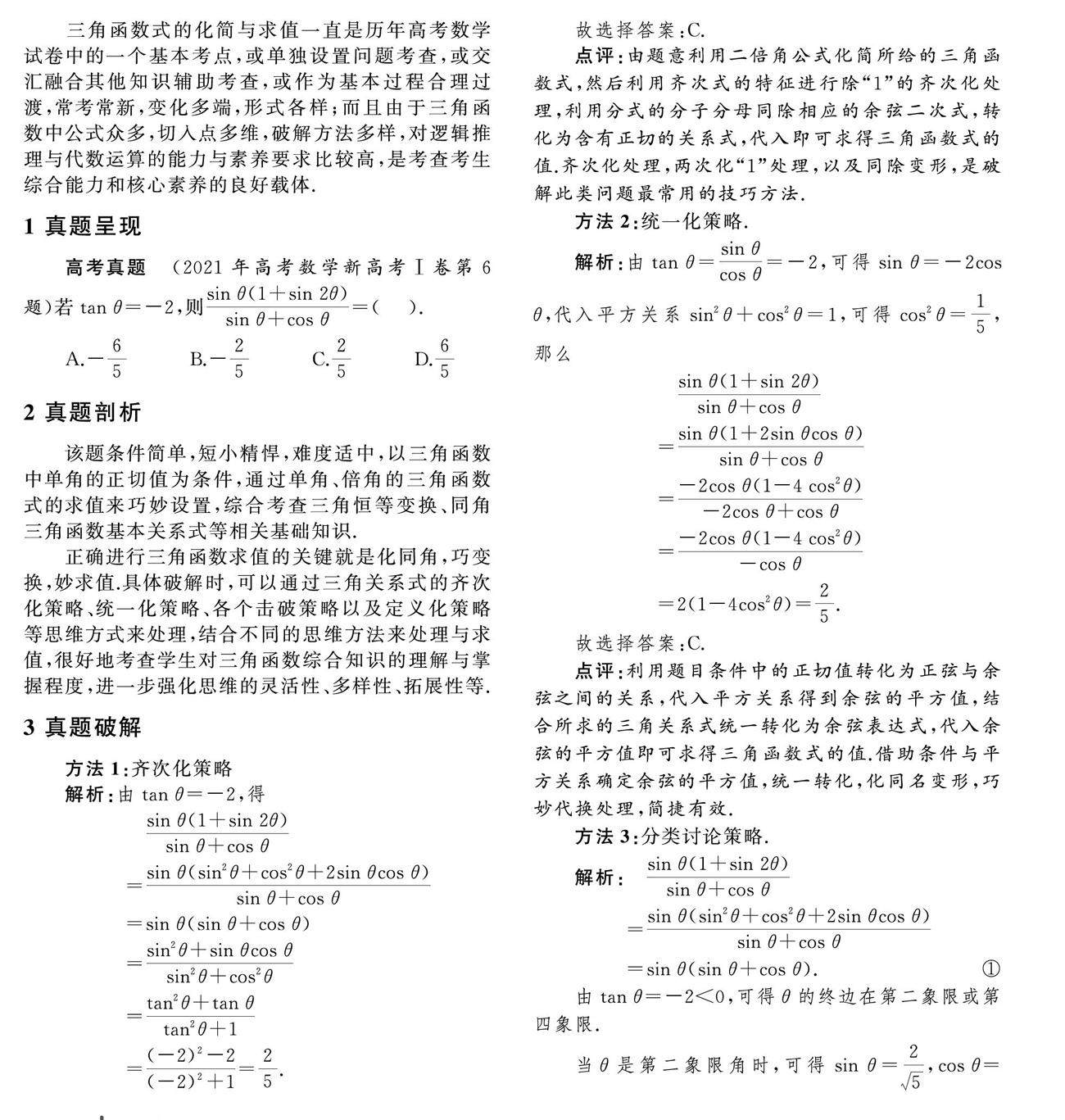 三角函数式的化简与求值一直是历年高考数学试卷中的一个基本考点,或单独设置问题考查,或交汇融合其他知识辅助考查,或作为基本过程合理过渡,常考常新,变化多端,形式各样;而且由于三角函数中公式众多,切入点多维,破解方法多样,对逻辑推理与代数运算的能力与素养要求比较高,是考查考生综合能力和核心素养的良好载体(剩余392字)
