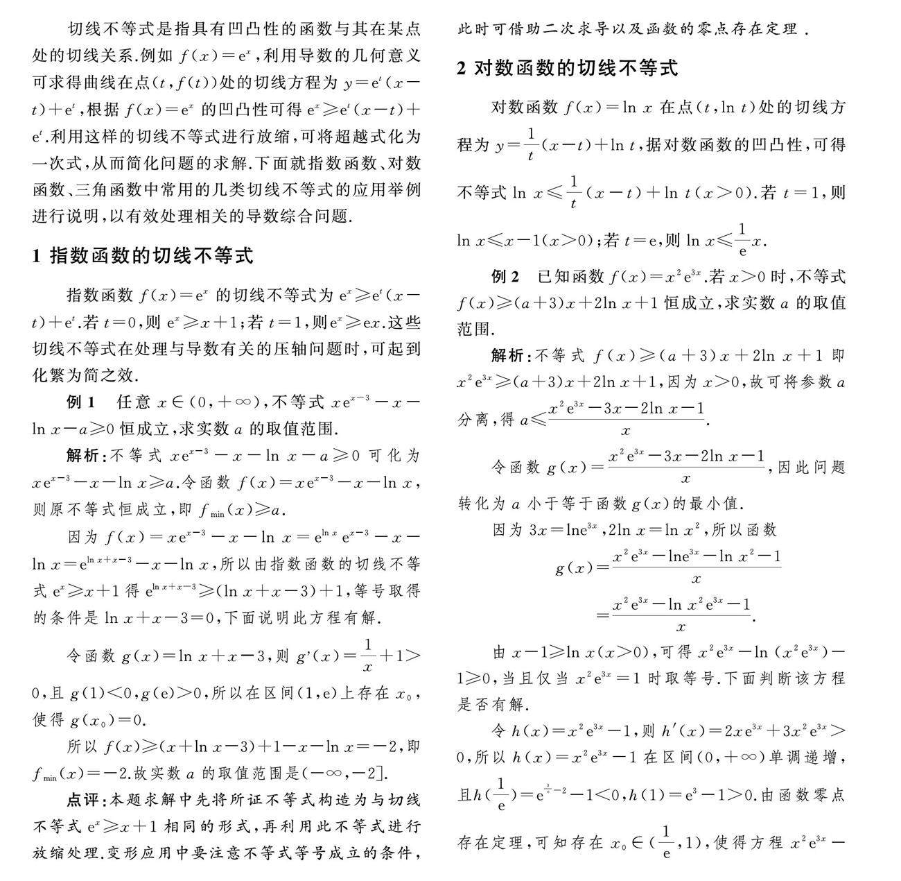 摘要:放缩法是处理函数与导数综合问题的重要工具,通过放缩可以将含有指数式、对数式或三角式的超越式化为一次式,从而简化问题的求解过程.利用曲线与其切线的位置关系进行放缩是常用的放缩方式,其中几种重要的切线不等式有指数函数的切线不等式、对数函数的切线不等式,以及三角函数的切线不等式.