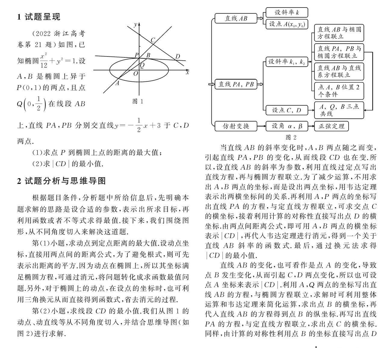 摘要:时隔一年,高考浙江卷的解析几何题再次考查圆锥曲线中的距离最值问题.此类问题知识应用性强,可从多角度进行探究,是解析几何中追根溯源、巧妙思维、多维拓展的良好载体.本文中针对2022年一道高考题,围绕图形给出多种解法,从动点动直线和仿射变换等多角度切入,选择合适的参数进行求解,同时利用韦达定理、换(剩余94字)