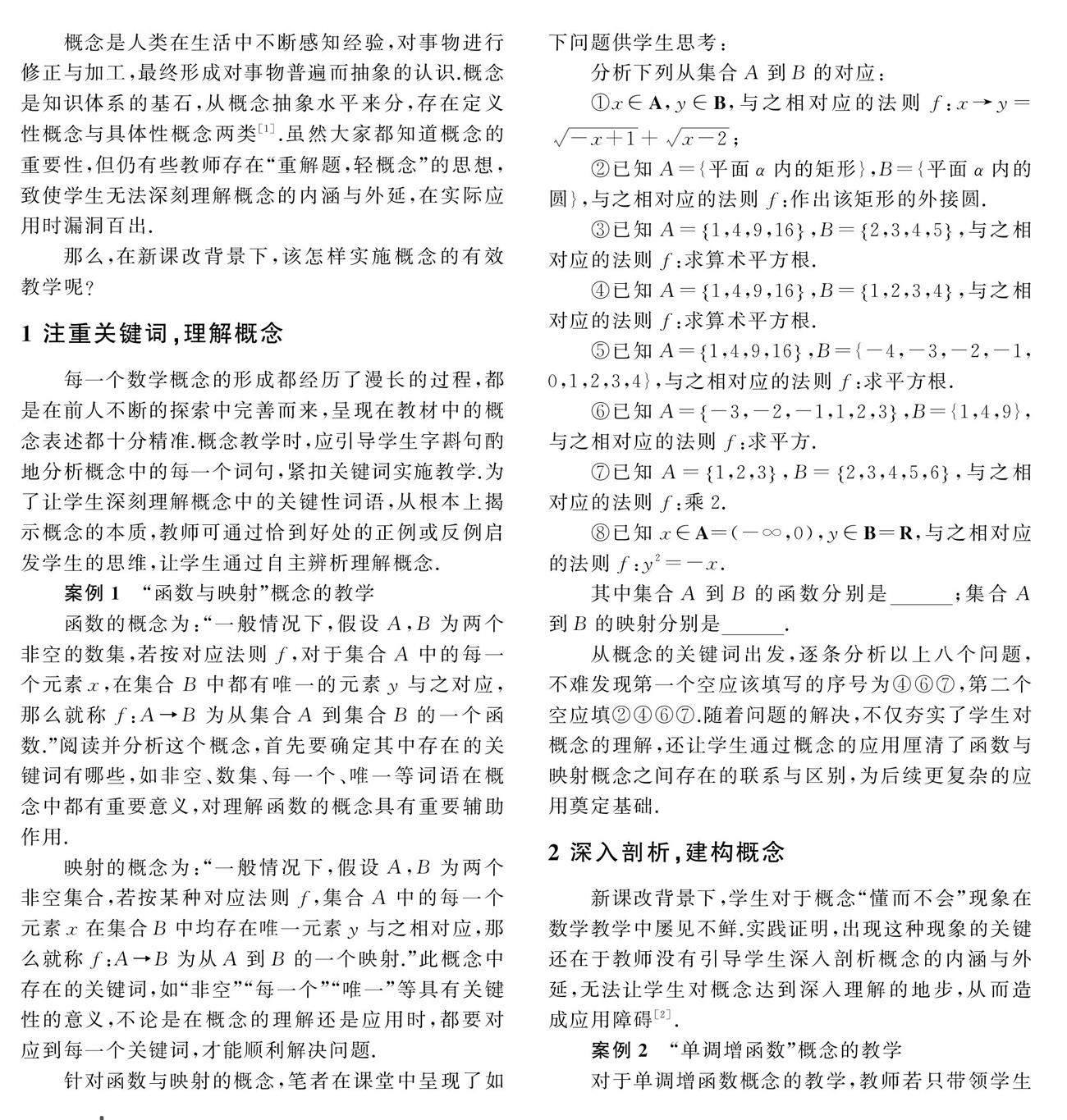 摘要:概念是构成数学结构的基础,具有发展数学思维、提炼数学思想方法等作用.概念教学既可作为“陈述性知识”,也可作为智慧与技能上的“程序性知识”实施教学.文章中从“注重关键词,理解概念;深入剖析,提炼概念;合作交流,建构概念;类比分析,体系化概念”四个方面对高中数学概念教学的策略展开分析.
