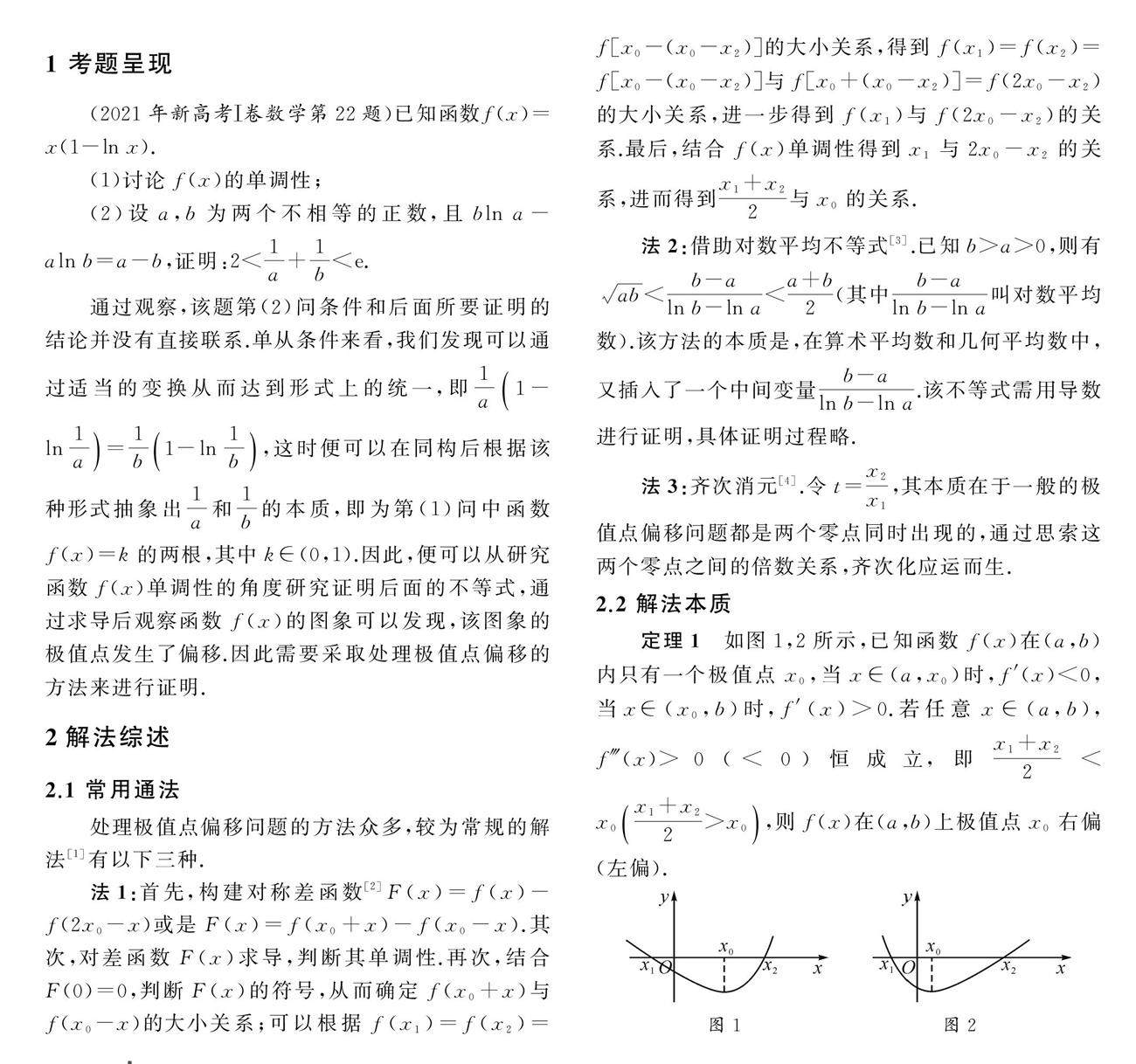 摘要:从2020年开始,新高考数学试卷关注数学本质,重视学生的数学思维,试题既有创新,又秉承传统.2021年高考数学新高考Ⅰ卷第22题将一道传统的极值点偏移问题重新搬上舞台,形式具有一定的创新,本质上巧妙地运用同构思想将数学问题进行化归.高中教学中,教师在处理极值点偏移问题时,会有意识地去引导学生用(剩余85字)