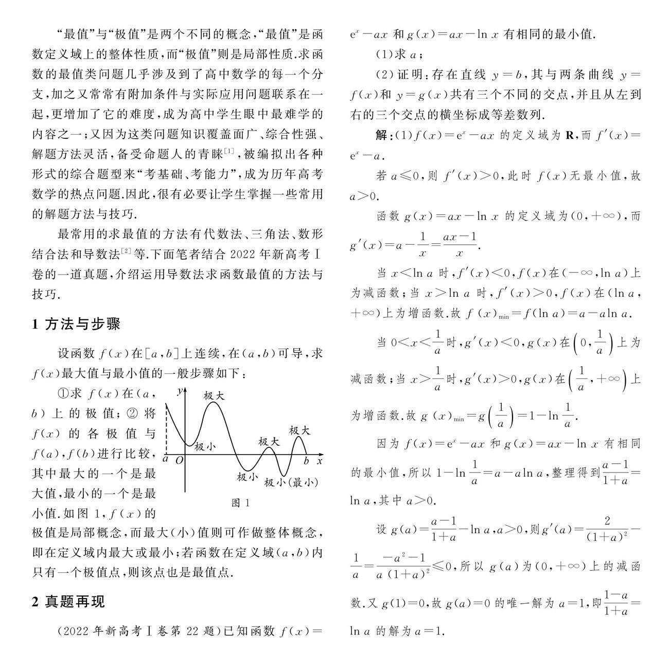 摘要:运用导数求函数最值的方法具有普遍性,通常是找出该区间上导数值为0的点,不必判断出是极大值点还是极小值点,只需将这些点对应的函数值与端点处的函数值进行比较,其中最大的就是函数的最大值,最小的就是函数的最小值.
