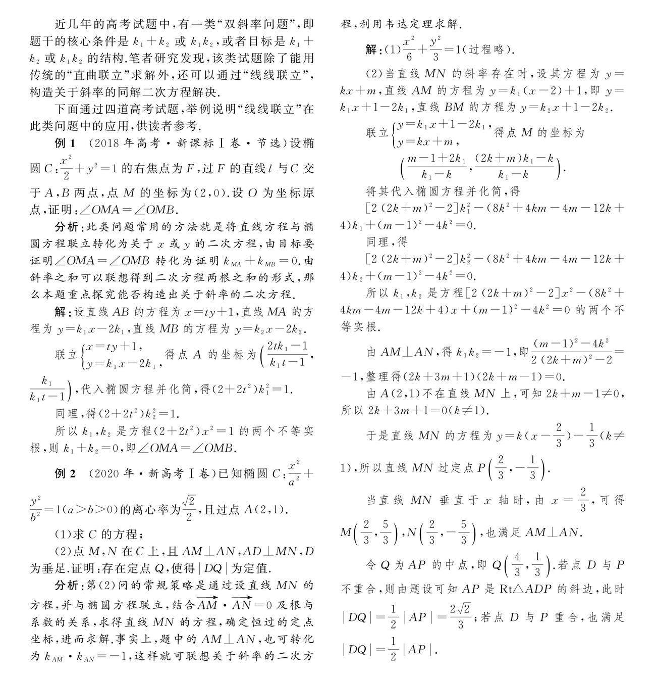 关键词:线线联立;同解方程;圆锥曲线;高考