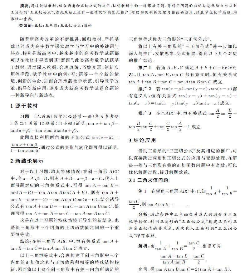 摘要:通过链接教材,结合两角和正切公式的应用,证明教材中的一道课后习题,并利用问题的归纳与总结给出对应斜三角形的“三正切公式”,在此基础上进行一般情况下的变式推广,借助实例剖析定理与推论的应用,拓展学生数学思维,培养核心素养.