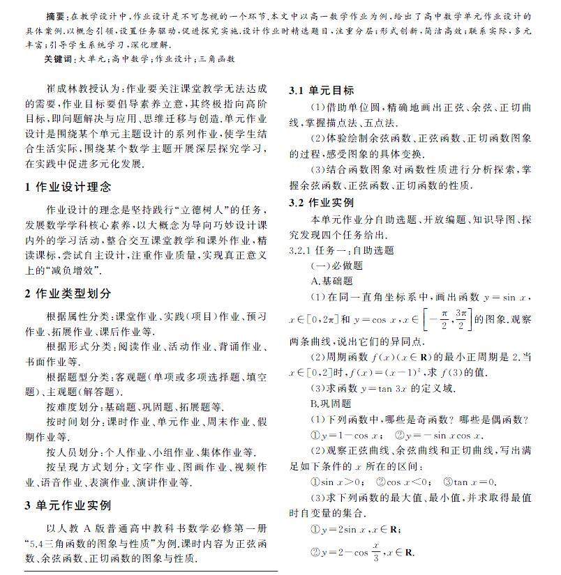 关键词:大单元;高中数学;作业设计;三角函数