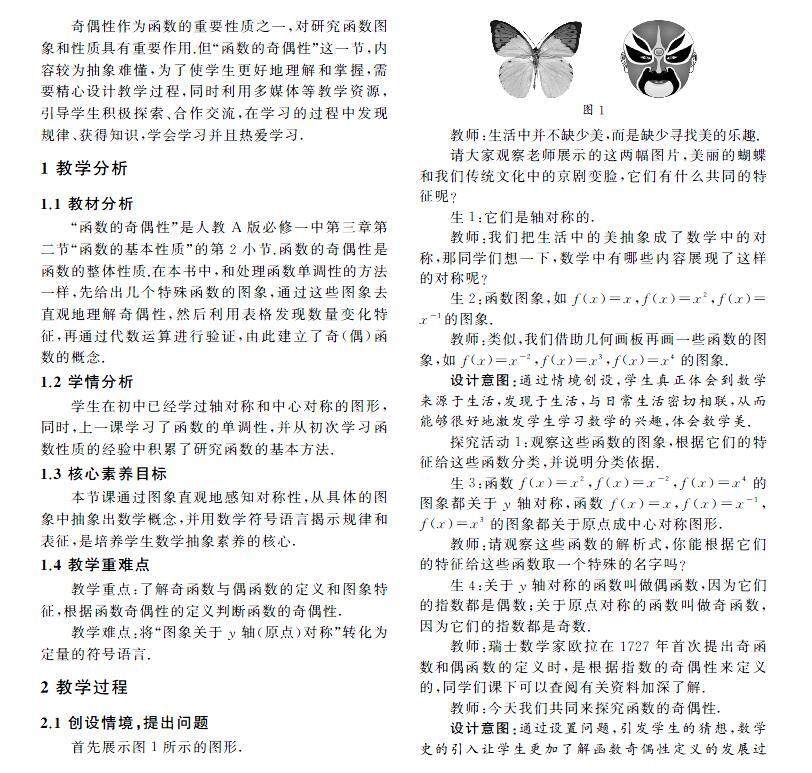 奇偶性作为函数的重要性质之一,对研究函数图象和性质具有重要作用.但“函数的奇偶性”这一节,内容较为抽象难懂,为了使学生更好地理解和掌握,需要精心设计教学过程,同时利用多媒体等教学资源,引导学生积极探索、合作交流,在学习的过程中发现规律、获得知识,学会学习并且热爱学习.
