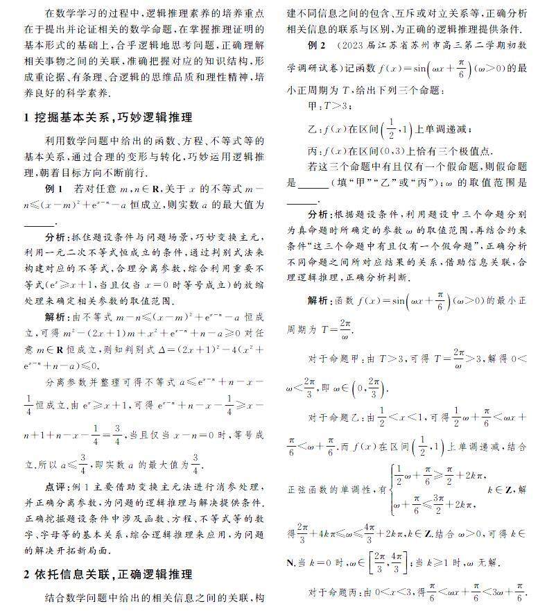 在数学学习的过程中,逻辑推理素养的培养重点在于提出并论证相关的数学命题,在掌握推理证明的基本形式的基础上,合乎逻辑地思考问题,正确理解相关事物之间的关联,准确把握对应的知识结构,形成重论据、有条理、合逻辑的思维品质和理性精神,培养良好的科学素养.