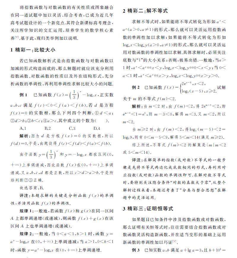 将指数函数与对数函数的有关性质或图象融合在同一道试题中加以灵活、综合考查,已成为近几年高考试题设计的一个新亮点.其符合新课标高考理念,关注所学知识的交汇运用,培养学生的数学核心素养[1].基于此,现归类举例加以说明.