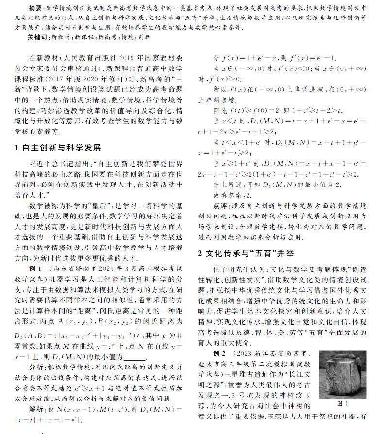 摘要:数学情境创设类试题是新高考数学试卷中的一类基本考点,体现了社会发展对高考的要求.根据数学情境创设中几类比较常见的形式,从自主创新与科学发展、文化传承与“五育”并举、生活情境与数学应用,以及研究探索与迁移创新等方面展开,结合实例来剖析与应用,有效培养学生的数学能力与数学核心素养等.