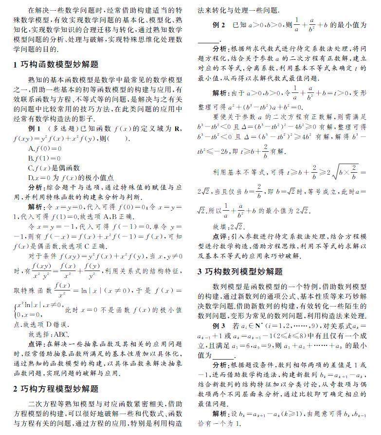 在解决一些数学问题时,经常借助构建适当的特殊数学模型,有效实现数学问题的基本化、模型化、熟知化,实现数学知识的合理迁移与转化,通过熟知数学模型问题的分析、处理与破解,实现特殊思维化处理数学问题的目的.