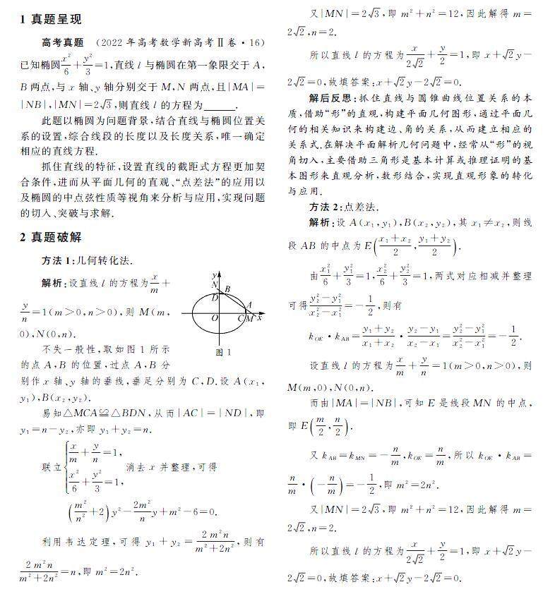 高考真题(2022年高考数学新高考Ⅱ卷·16)已知椭圆x26+y23=1,直线l与椭圆在第一象限交于A,B两点,与x轴、y轴分别交于M,N两点,且|MA|=|NB|,|MN|=23,则直线l的方程为.
