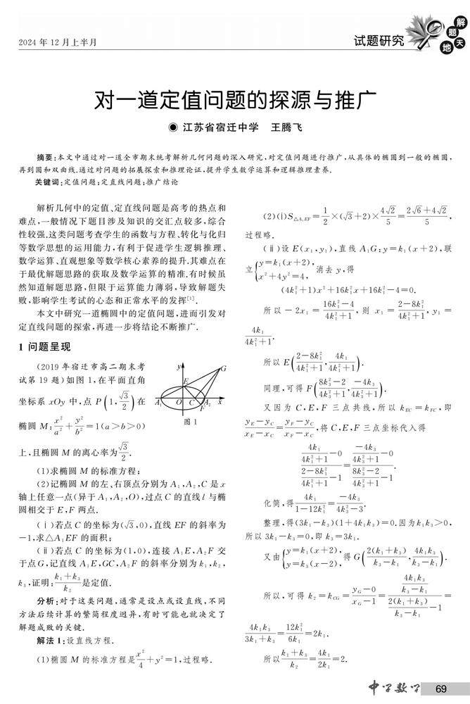 摘要:本文中通过对一道全市期末统考解析几何问题的深入研究,对定值问题进行推广,从具体的椭圆到一般的椭圆,再到圆和双曲线.通过对问题的拓展探索和推理论证,提升学生数学运算和逻辑推理素养.