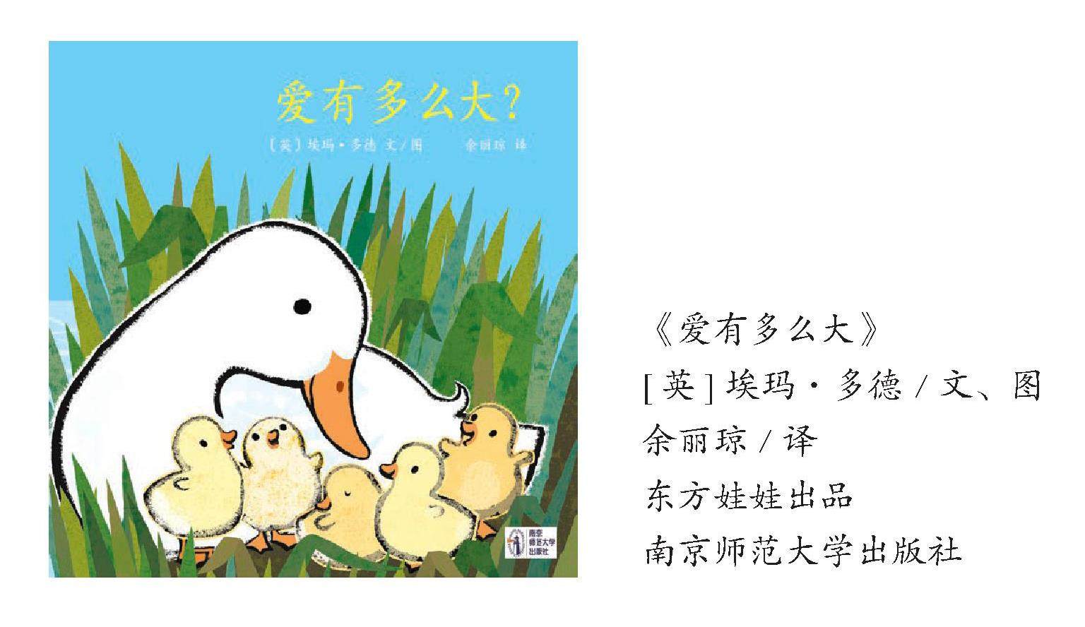 爱是一种抽象的情感,要回答这个问题似乎不太容易。但也许,我们可以在绘本《爱有多么大》中跟随鸭妈妈和宝宝的脚步,一起找寻答案。鸭子们经过汪洋大海、高耸群山,又看过漫天星辰,当鸭妈妈说起“爱比海洋还要宽,比大海还要深”“爱比山还要高”“爱比最远的星星还要远”时,爱的广度和深度得到了具象的显现。(剩余985字)