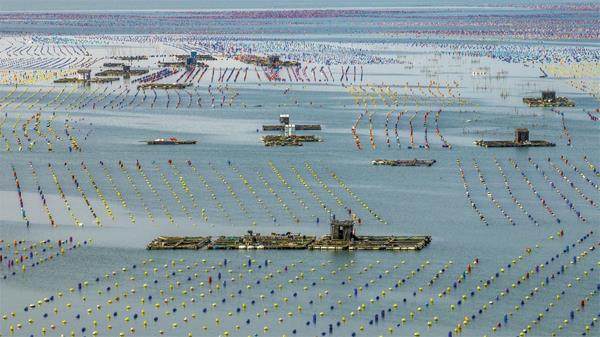 2023年8月18日,广东汕头,南澳县面积超两万亩的生蚝海洋牧场已被五彩缤纷的环保浮球覆盖,好似一片“彩虹海” 。那是当地用来养殖牡蛎的设施,可以用来固定和悬挂生蚝苗,通过有效控制养殖密度、生蚝滤水时间,提高生蚝产量和质量。牧场渔船往来穿梭采收生蚝,也成了游客眼中亮丽的风景线。