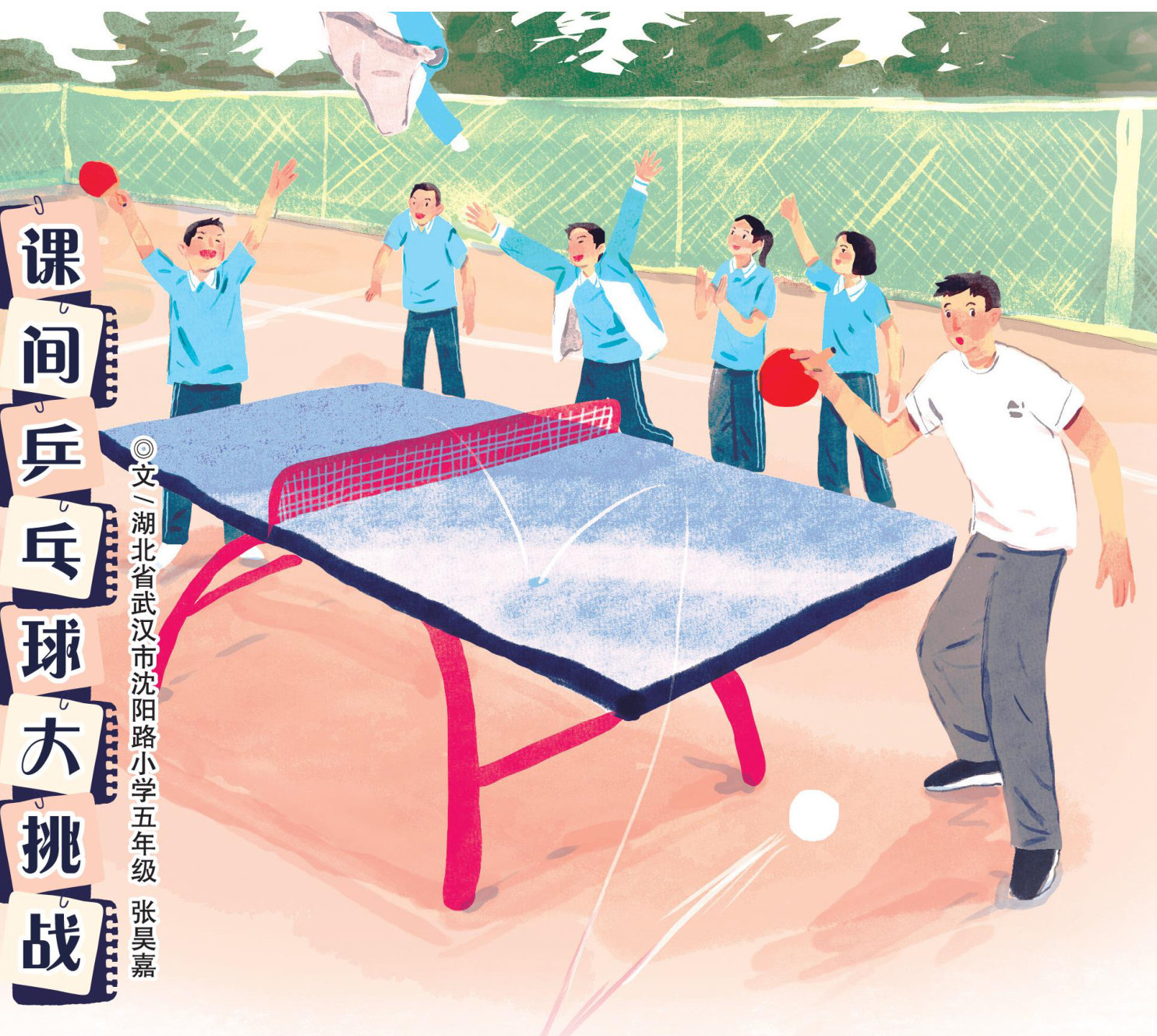 下课铃欢快地响起来,我“嗖”地从书包里掏出乒乓球拍冲向操场。今天我要向号称“乒乓小霸王”的四(3)班发起挑战!最近我已经打败好几个班啦,就差这块难啃的“硬骨头”,今天必须把他们打趴下!