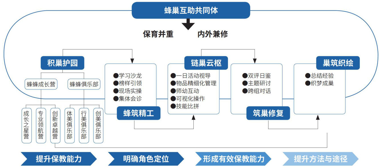 针对保育员职后教育的常见问题,笔者所在园所构建了“蜂巢互助共同体”,保育员通过分享经验、交流技巧、共同学习等方式,互相支持、互相激励,形成了高效学习和实践的互助合作共同体,以期助力保育员保教能力提升。
