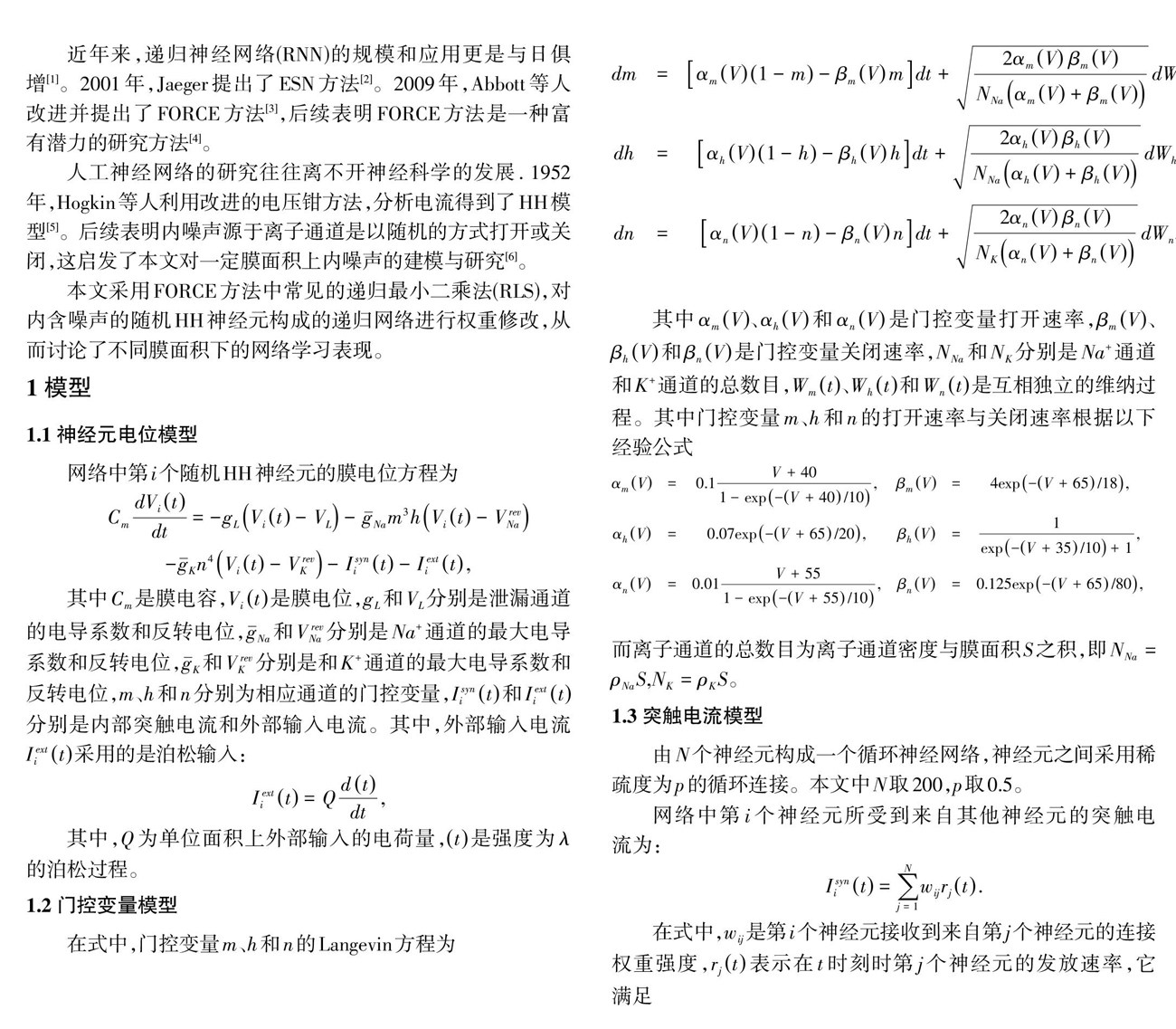 关键词:递归最小二乘法; 随机Hodgkin-Huxley模型; 神经网络; 内噪声; 膜面积.