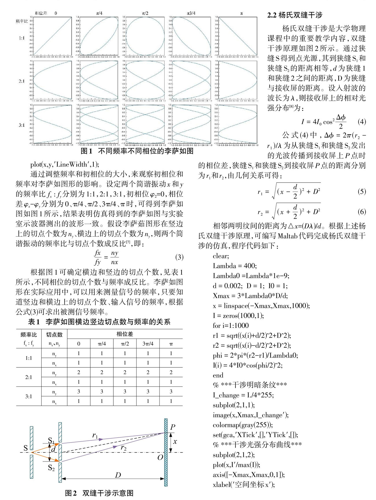 摘要:文章讨论了Matlab软件在大学物理课程教学中的应用。通过对大学普通物理中李萨如图、杨氏双缝干涉等模拟仿真,可以直观形象地向学生呈现课程内容,丰富教学手段,将理论知识与实践结合起来,调动学生学习主动性,增强理解能力,提升课堂教学质量。
