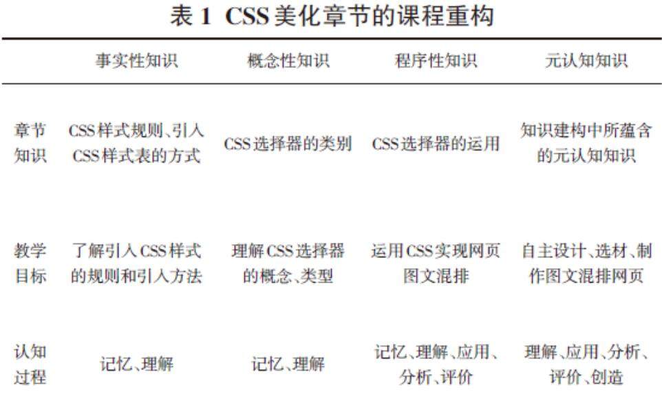 摘要:在在线教学常态化背景下,结合精品在线开放课程资源和网络教学平台等资源,运用布卢姆教育目标分类学理论,对《网页设计与制作》课程进行重构,针对事实性知识、概念性知识、程序性知识和元认知知识四种不同类型知识,依据记忆、理解、应用、分析、评价、创造六大认知过程,设计教学活动,探索混合式教学模式并开展教学实践。(剩余4764字)