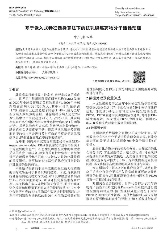 基于嵌入式特征选择算法下的抗乳腺癌药物分子活性预测