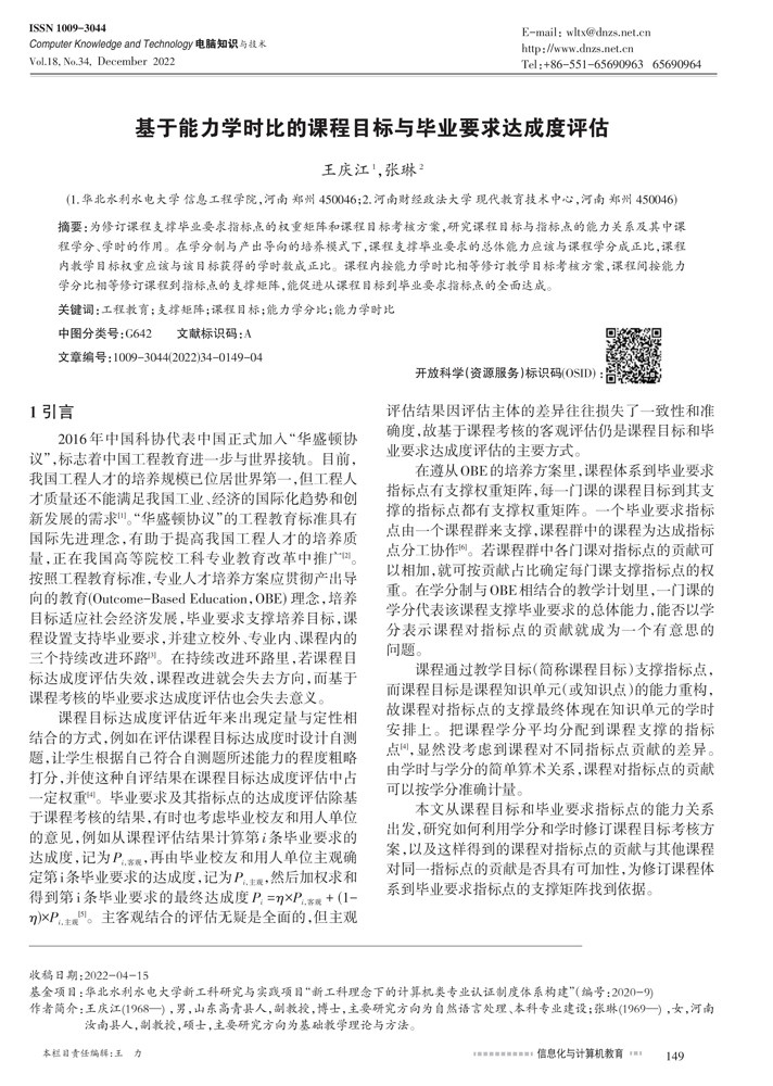 摘要:为修订课程支撑毕业要求指标点的权重矩阵和课程目标考核方案,研究课程目标与指标点的能力关系及其中课程学分、学时的作用。在学分制与产出导向的培养模式下,课程支撑毕业要求的总体能力应该与课程学分成正比,课程内教学目标权重应该与该目标获得的学时数成正比。课程内按能力学时比相等修订教学目标考核方案,课程间按能力学分比相等修订课程到指标点的支撑矩阵,能促进从课程目标到毕业要求指标点的全面达成。(剩余2117字)