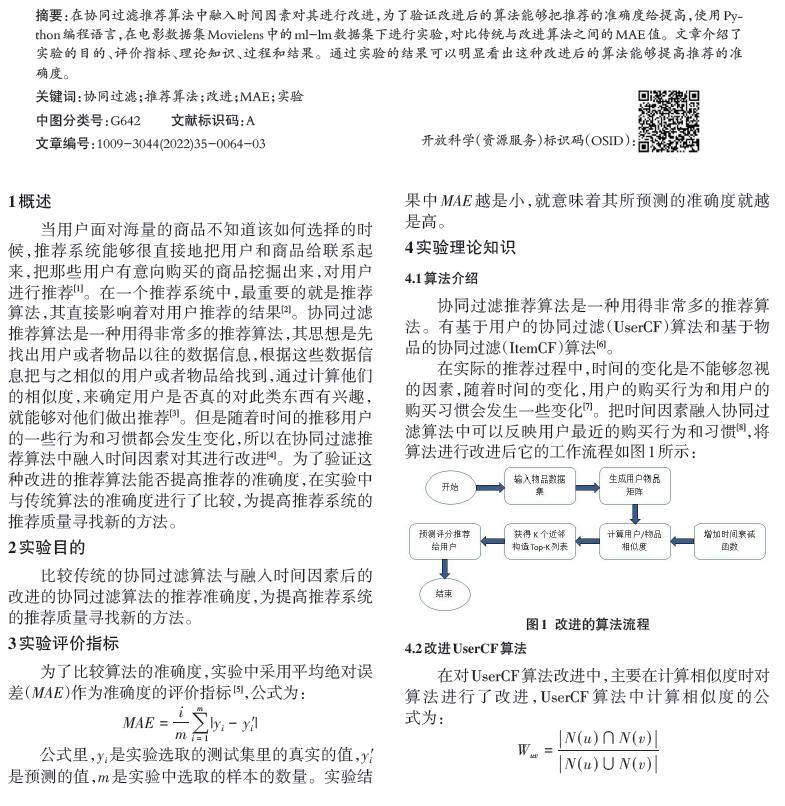 摘要:在协同过滤推荐算法中融入时间因素对其进行改进,为了验证改进后的算法能够把推荐的准确度给提高,使用Python编程语言,在电影数据集Movielens中的ml-lm数据集下进行实验,对比传统与改进算法之间的MAE值。文章介绍了实验的目的、评价指标、理论知识、过程和结果。通过实验的结果可以明显看出这种改进后的算法能够提高推荐的准确度。(剩余3308字)