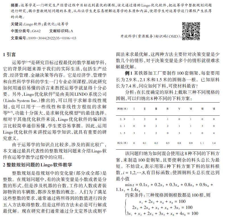摘要:运筹学是一门研究生产经营过程中目标达到最优的课程,该文通过借助Lingo优化软件,把运筹学中整数规划问题进行研究,揭示整数规划问题的本质,从而让学生更容易理解运筹学的本质和内涵,使得学生对运筹学这门课程产生浓厚的兴趣。