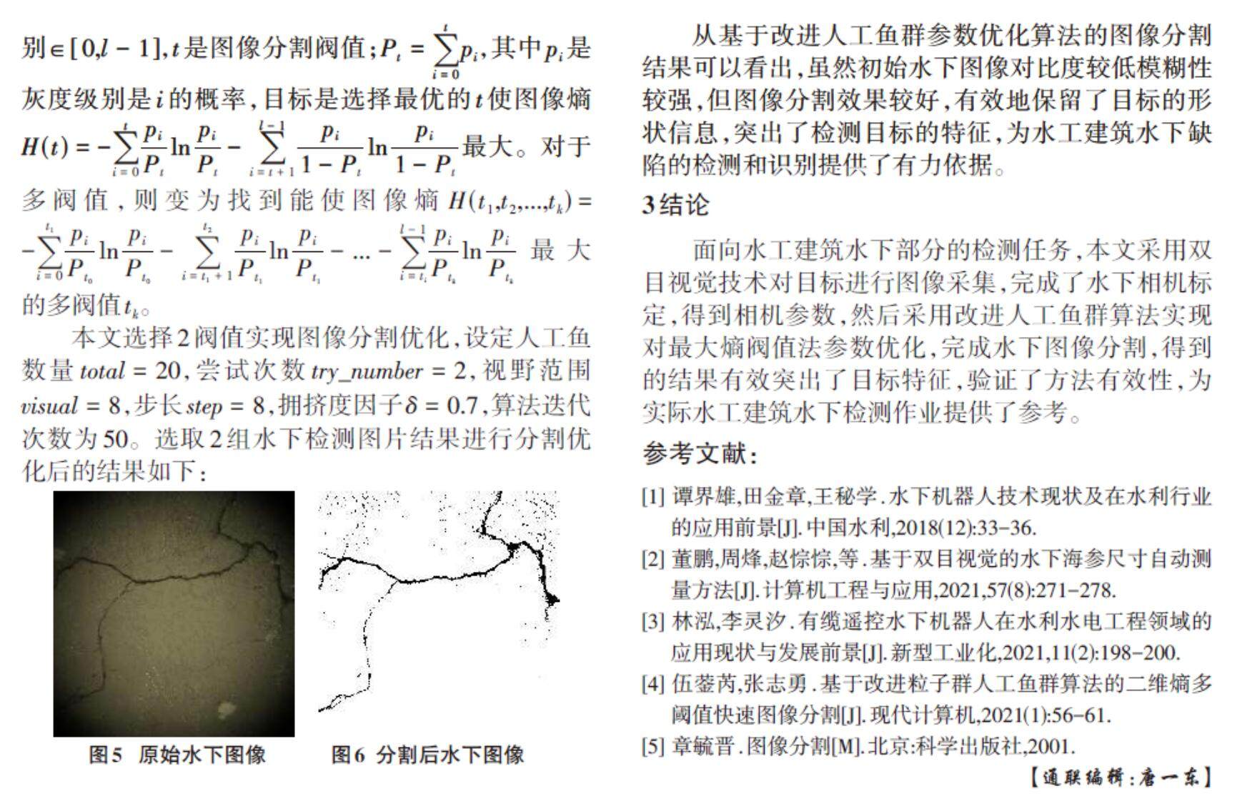 摘要:大坝、水闸、泵站等水工建筑结构在施工时可能存在某些缺陷,特别随着水工建筑物的服役期限逐渐增长,由于水流侵蚀和冻融风化作用,其水下结构会出现裂缝、凹坑、侵蚀等缺陷,严重影响水工建筑的服役安全。文章提出基于双目视觉技术提高水工建筑水下检测任务完成质量。首先进行水下双目相机标定,然后采用改进人工鱼群算法应用于最大熵阈值法完成水下图像分割,图像分割结果突出检测目标特征,为水下检测工作提供了参考和依据。(剩余3942字)