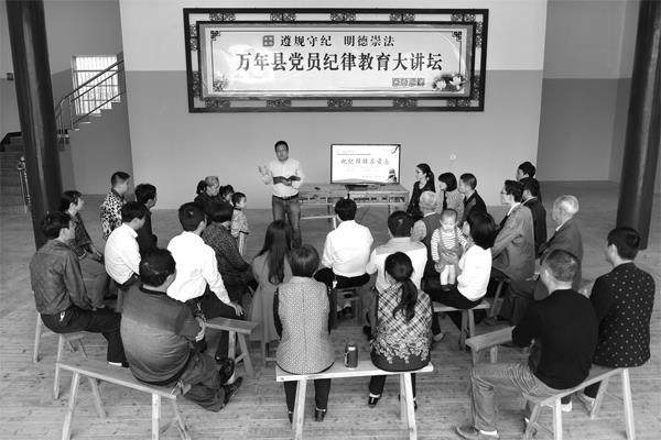 江西省上饶市万年县陈营镇马塘社区纪检监察干事黄中华在为党员和群众作题为“把纪律挺在前面”的专题宣讲。新华社
