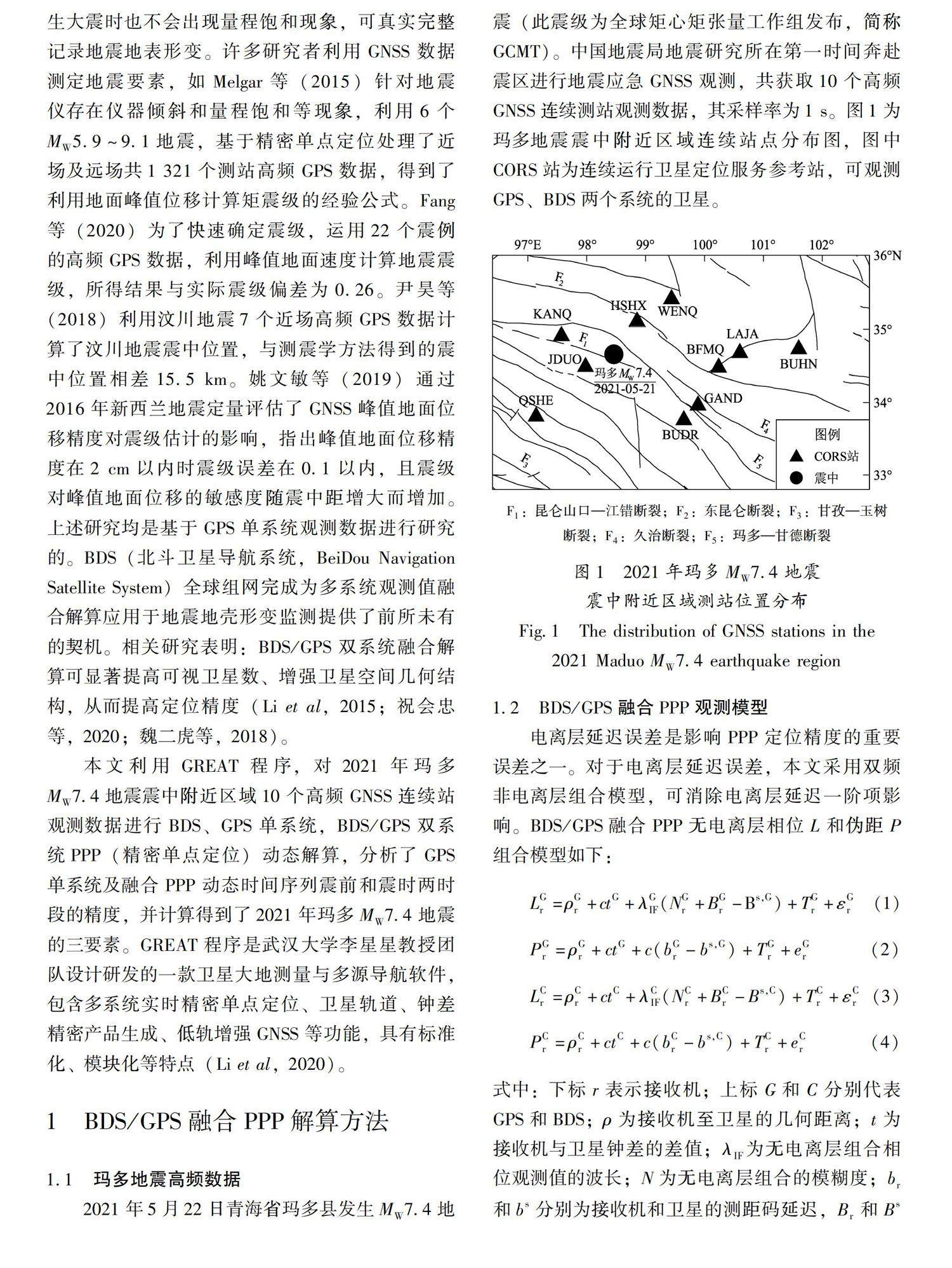 高频BDS/GPS融合PPP确定2021年玛多MW7.4地震三要素
