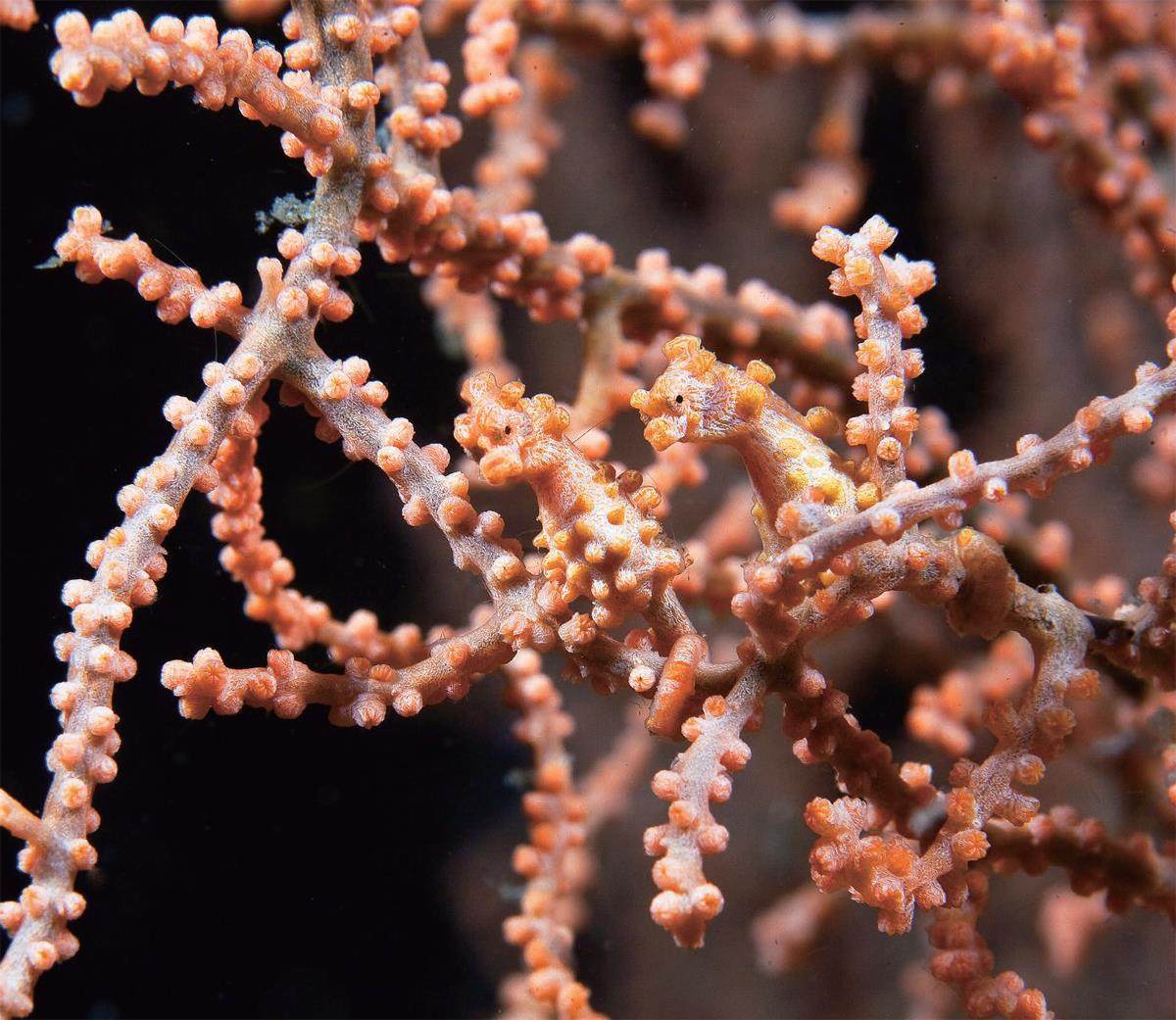 在五彩斑斓的珊瑚中,柳珊瑚可是个" 疙瘩大王"——它的枝干上布满了星星点点的小突起,活像长了一身" 珊瑚豆"。小小的侏儒海马就专门住在这种珊瑚上,它们不到2.5 厘米长,身体的颜色、形状都和珊瑚上的“小疙瘩”一模一样。这些聪明的小家伙会挑选和自己最匹配的“疙瘩”当背景,当它们用尾巴缠住珊瑚枝,混迹在(剩余55字)