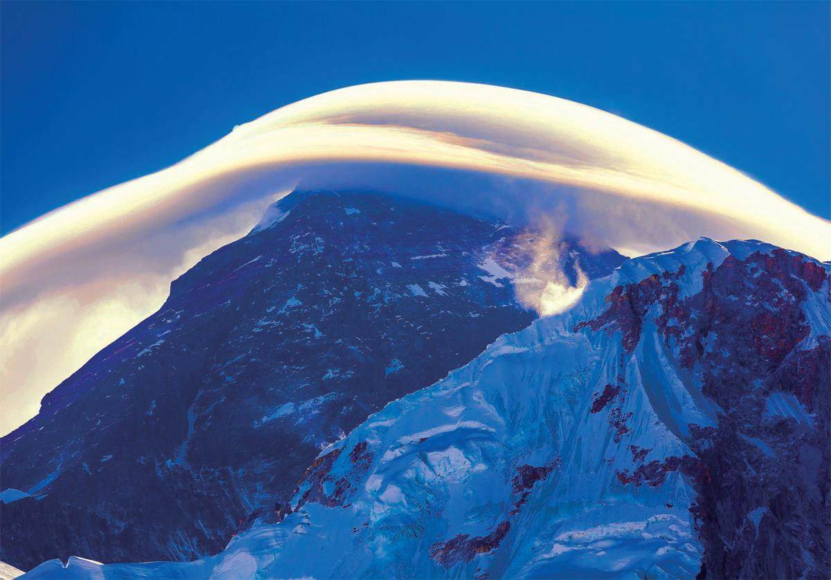 这顶神奇的“帽子”是怎么变出来的呢?原来,当湿润的气流爬升到山顶,其中的水汽遇冷凝结成无数细小水珠,汇聚成云。在高空下沉气流的控制下,云朵向四周铺展开,就像一顶大帽子不偏不倚地盖在山顶 上。(剩余80字)