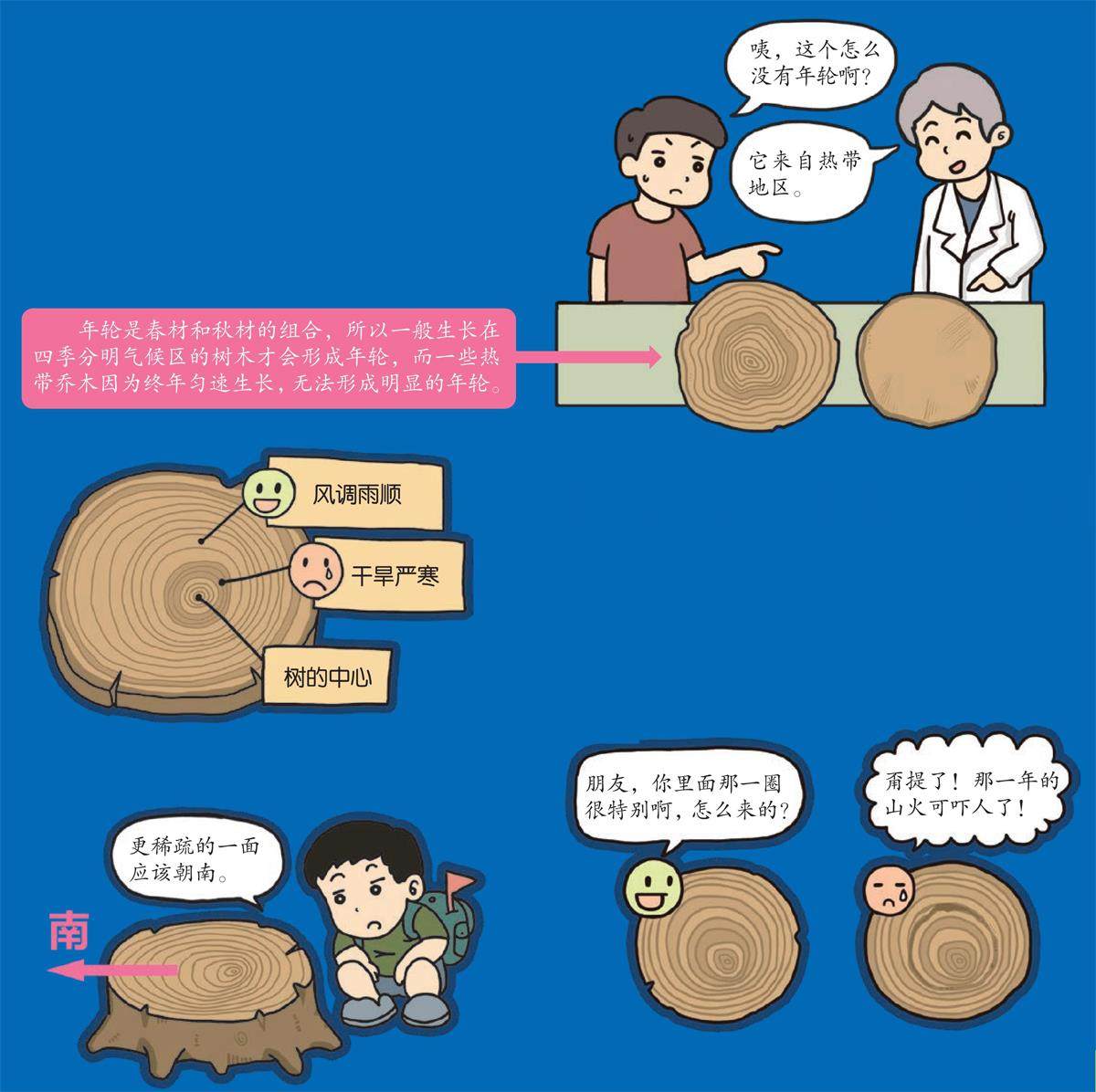 从树桩的中心开始,数一数有多少完整的圆环,就能大致推断出这棵树的年纪。大树每年都会在树皮下悄悄长出一圈新的木质层:春天长得快,形成颜色较浅的“春材”,秋天生长变慢,形成颜色较深的“秋材”;一浅一深合在一起,才是一圈“年轮”。(剩余363字)
